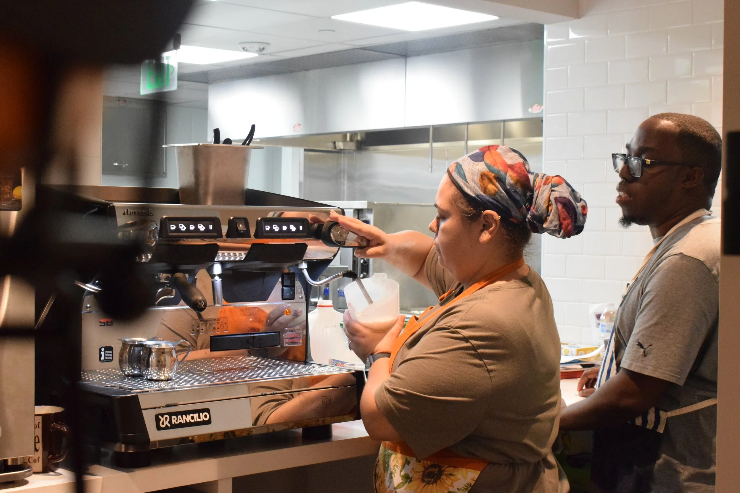 Thanks to our incredible supporters, we were able to install a full-fledged coffee shop style cafe on the outside of our teaching kitchen! Members use all the latest equipment, including a very nice espresso machine, to craft delicious specialty coffee drinks. Everything from an Americano to a flavored latte or cappuccino with plenty of steamy foam!